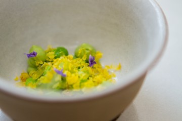 Published 24 April 2014 at 2000 × 1333 in Eleven Madison Park Peas and pea puree, shaved egg yolk, sorrel flowers. ‹ Return to post